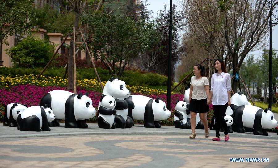 Two citizens look at panda figures displayed during the open-air show "1st Panda" in Shenyang, capital of northeast China's Liaoning Province, July 7, 2014. A hundred panda figures made from bamboo scraps are shown during the event, which aims at promoting environmental awareness. (Xinhua/Pan Yulong) |