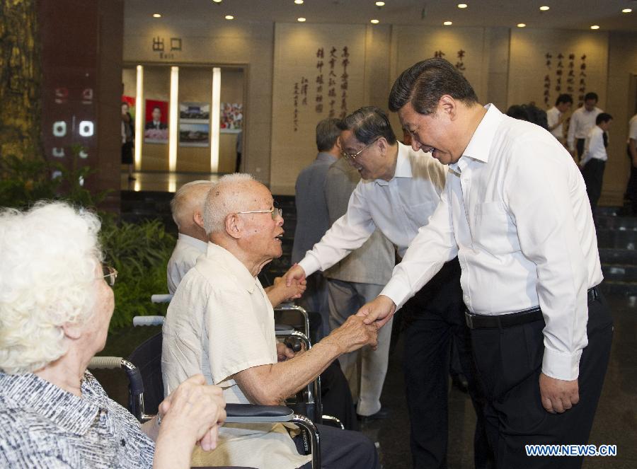 Chinese President Xi Jinping (1st R), who is also the general-secretary of the Communist Party of China Central Committee and chairman of the Central Military Commission, visits veterans who took part in the Chinese people's war of resistance against Japanese invasion, after attending a gathering to mark the 77th anniversary of the start of the war, in Beijing, capital of China, July 7, 2014. (Xinhua/Huang Jingwen) |