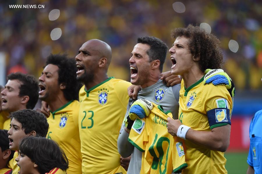 Brazil's David Luiz (1st R) and goalkeeper Julio Cesar (2nd R) hold Neymar's jersey while singing Brazil's national anthem before a semifinal match between Brazil and Germany of 2014 FIFA World Cup at the Estadio Mineirao Stadium in Belo Horizonte, Brazil, on July 8, 2014.(Xinhua/Liu Dawei) |