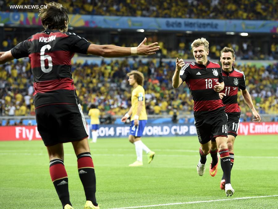 Germany's Miroslav Klose (R) and Sami Khedira (L) celebrate with Toni Kroos (C) for Toni's second goal during a semifinal match between Brazil and Germany of 2014 FIFA World Cup at the Estadio Mineirao Stadium in Belo Horizonte, Brazil, on July 8, 2014.(Xinhua/Qi Heng) |