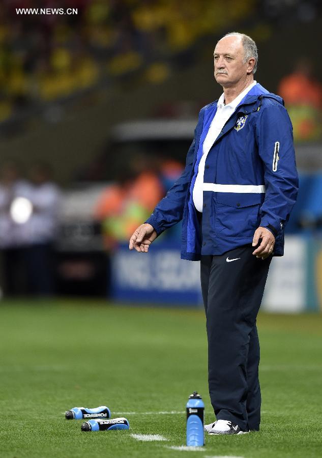 Brazil's coach Luiz Felipe Scolari looks on during a semifinal match between Brazil and Germany of 2014 FIFA World Cup at the Estadio Mineirao Stadium in Belo Horizonte, Brazil, on July 8, 2014. Germany won 7-1 over Brazil and qualified for the final on Tuesday. (Xinhua/Qi Heng)
