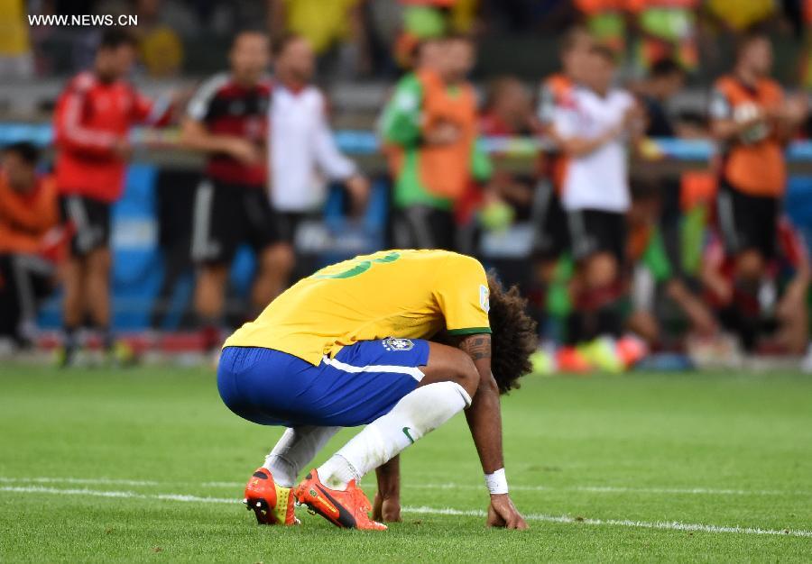 Brazil's Dante reacts after a semifinal match between Brazil and Germany of 2014 FIFA World Cup at the Estadio Mineirao Stadium in Belo Horizonte, Brazil, on July 8, 2014. Germany won 7-1 over Brazil and qualified for the final on Tuesday.(Xinhua/Li Ga) |