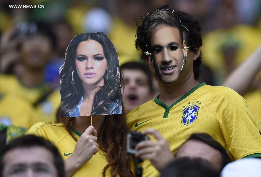 Brazil's supporters pose wearing masks of Neymar and his girlfriend Bruna during a semifinal match between Brazil and Germany of 2014 FIFA World Cup at the Estadio Mineirao Stadium in Belo Horizonte, Brazil, on July 8, 2014. Germany won 7-1 over Brazil and qualified for the final on Tuesday. (Xinhua/Qi Heng) |