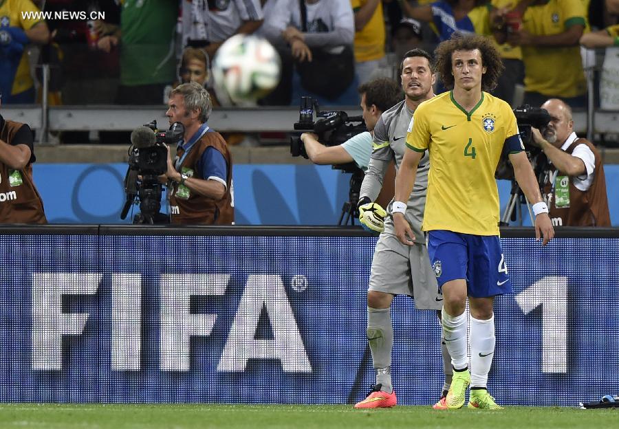 Brazil's David Luiz (R) and goalkeeper Julio Cesar look on during a semifinal match between Brazil and Germany of 2014 FIFA World Cup at the Estadio Mineirao Stadium in Belo Horizonte, Brazil, on July 8, 2014. Germany won 7-1 over Brazil and qualified for the final on Tuesday. (Xinhua/Qi Heng)
