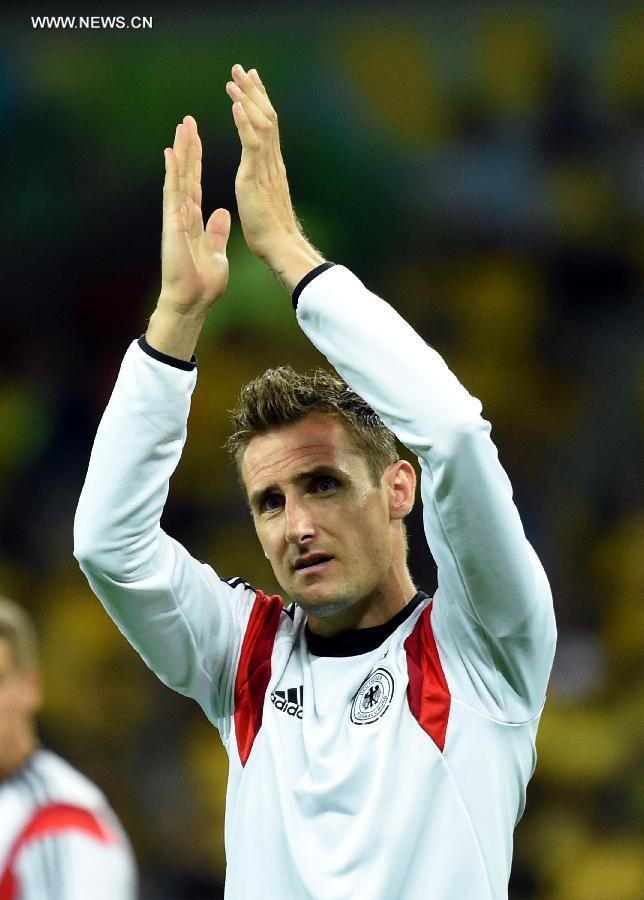 Germany's Miroslav Klose applauds spectators after a semifinal match between Brazil and Germany of 2014 FIFA World Cup at the Estadio Mineirao Stadium in Belo Horizonte, Brazil, on July 8, 2014. Germany won 7-1 over Brazil and qualified for the final on Tuesday. (Xinhua/Liu Dawei)