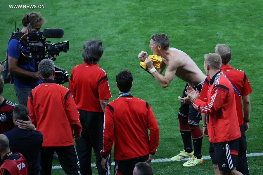 Germany's Miroslav Klose applauds spectators after a semifinal match between Brazil and Germany of 2014 FIFA World Cup at the Estadio Mineirao Stadium in Belo Horizonte, Brazil, on July 8, 2014. Germany won 7-1 over Brazil and qualified for the final on Tuesday. (Xinhua/Liu Dawei)