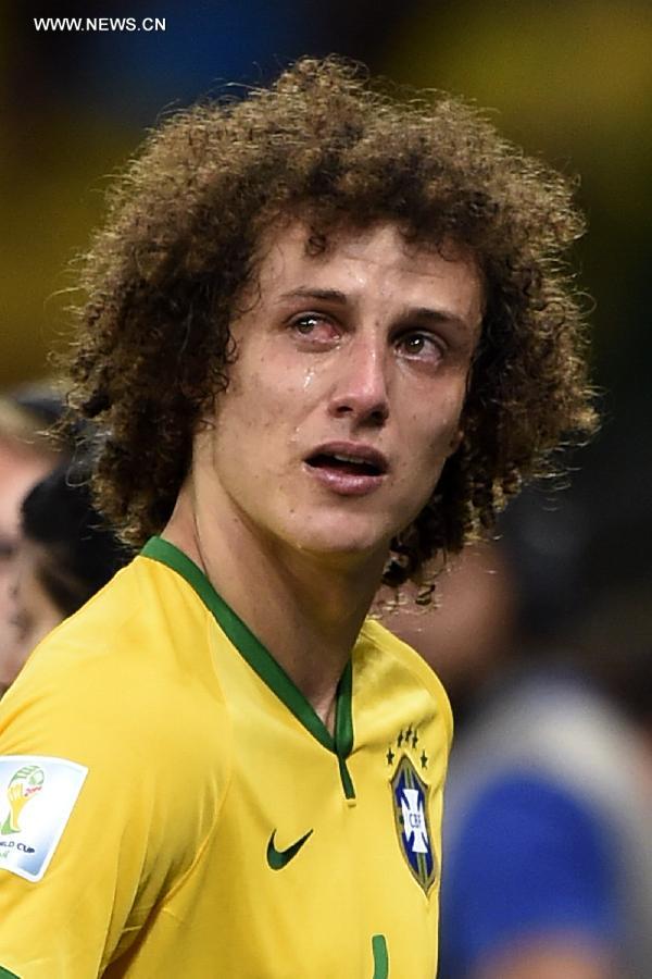 Brazil's David Luiz looks on with tears after a semifinal match between Brazil and Germany of 2014 FIFA World Cup at the Estadio Mineirao Stadium in Belo Horizonte, Brazil, on July 8, 2014. Germany won 7-1 over Brazil and qualified for the final on Tuesday. (Xinhua/Qi Heng) |
