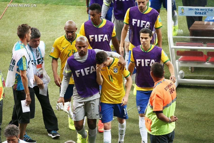 Brazil's players leave the field after a semifinal match between Brazil and Germany of 2014 FIFA World Cup at the Estadio Mineirao Stadium in Belo Horizonte, Brazil, on July 8, 2014. Germany won 7-1 over Brazil and qualified for the final on Tuesday.(Xinhua/Li Ming) |