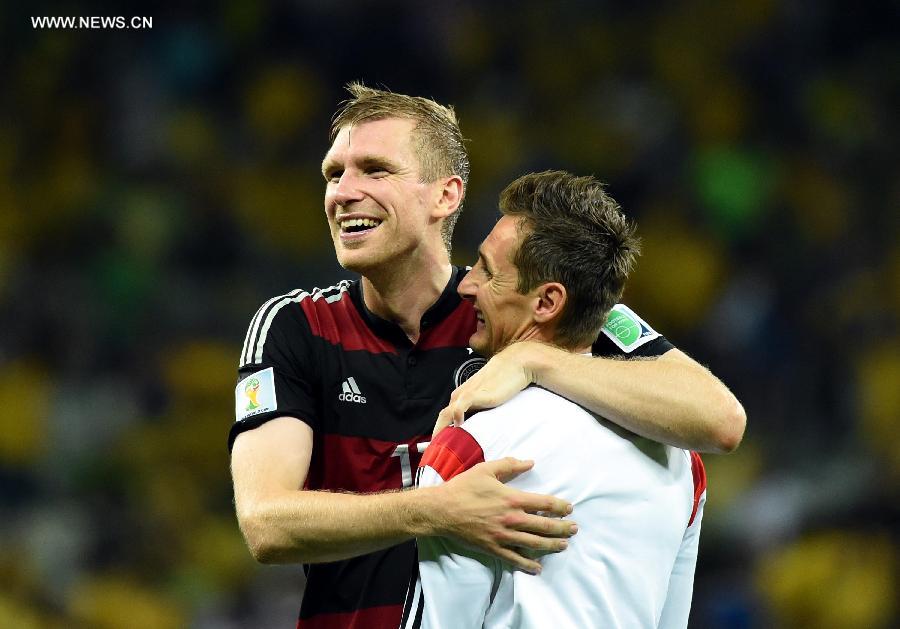 Germany's Per Mertesacker (L) and Miroslav Klose celebrate their victory after a semifinal match between Brazil and Germany of 2014 FIFA World Cup at the Estadio Mineirao Stadium in Belo Horizonte, Brazil, on July 8, 2014. Germany won 7-1 over Brazil and qualified for the final on Tuesday. (Xinhua/Liu Dawei) |
