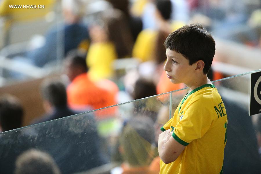 A Brazil's fan reacts while watching a semifinal match between Brazil and Germany of 2014 FIFA World Cup at the Estadio Mineirao Stadium in Belo Horizonte, Brazil, on July 8, 2014. Germany won 7-1 over Brazil and qualified for the final on Tuesday.(Xinhua/Li Ming) |
