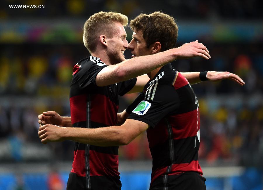 Germany's Thomas Muller (R) celebrates a goal during a semifinal match between Brazil and Germany of 2014 FIFA World Cup at the Estadio Mineirao Stadium in Belo Horizonte, Brazil, on July 8, 2014. Germany won 7-1 over Brazil and qualified for the final on Tuesday.(Xinhua/Li Ga) |
