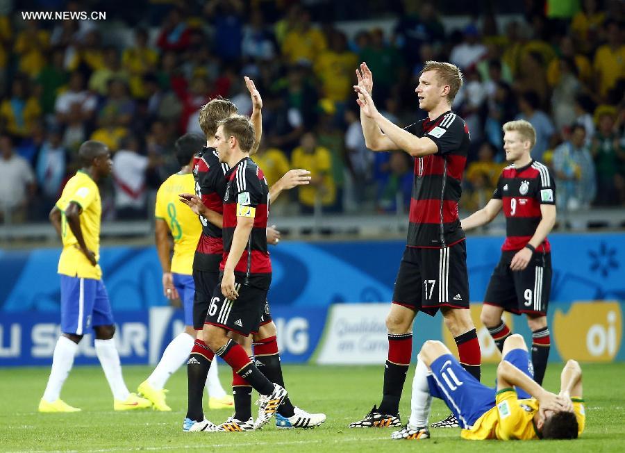 Germany's players celebrate the victory after a semifinal match between Brazil and Germany of 2014 FIFA World Cup at the Estadio Mineirao Stadium in Belo Horizonte, Brazil, on July 8, 2014. Germany won 7-1 over Brazil and qualified for the final on Tuesday.(Xinhua/Chen Jianli) |