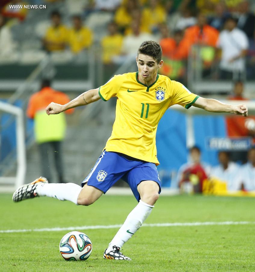 Brazil's Oscar shoots a goal during a semifinal match between Brazil and Germany of 2014 FIFA World Cup at the Estadio Mineirao Stadium in Belo Horizonte, Brazil, on July 8, 2014. Germany won 7-1 over Brazil and qualified for the final on Tuesday.(Xinhua/Chen Jianli) |