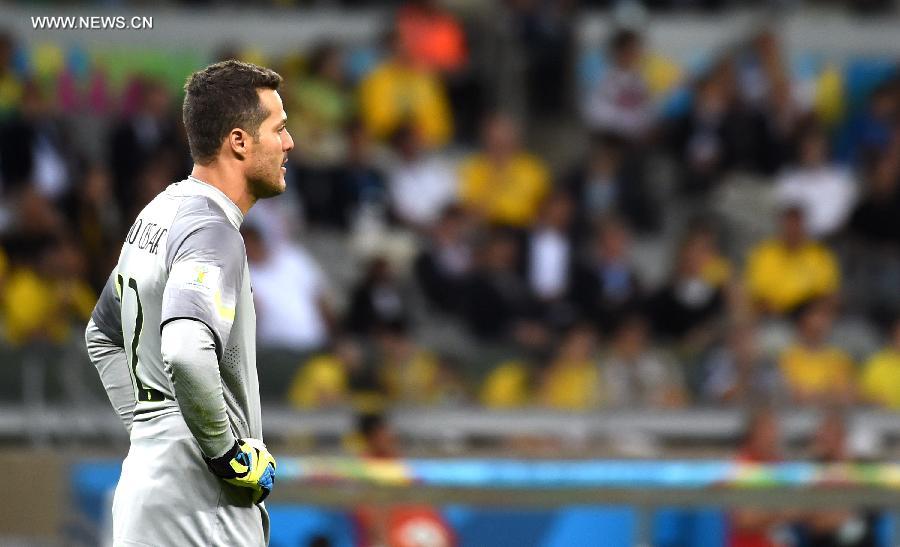 Brazil's goalkeeper Julio Cesar reacts during a semifinal match between Brazil and Germany of 2014 FIFA World Cup at the Estadio Mineirao Stadium in Belo Horizonte, Brazil, on July 8, 2014. Germany won 7-1 over Brazil and qualified for the final on Tuesday.(Xinhua/Li Ga)