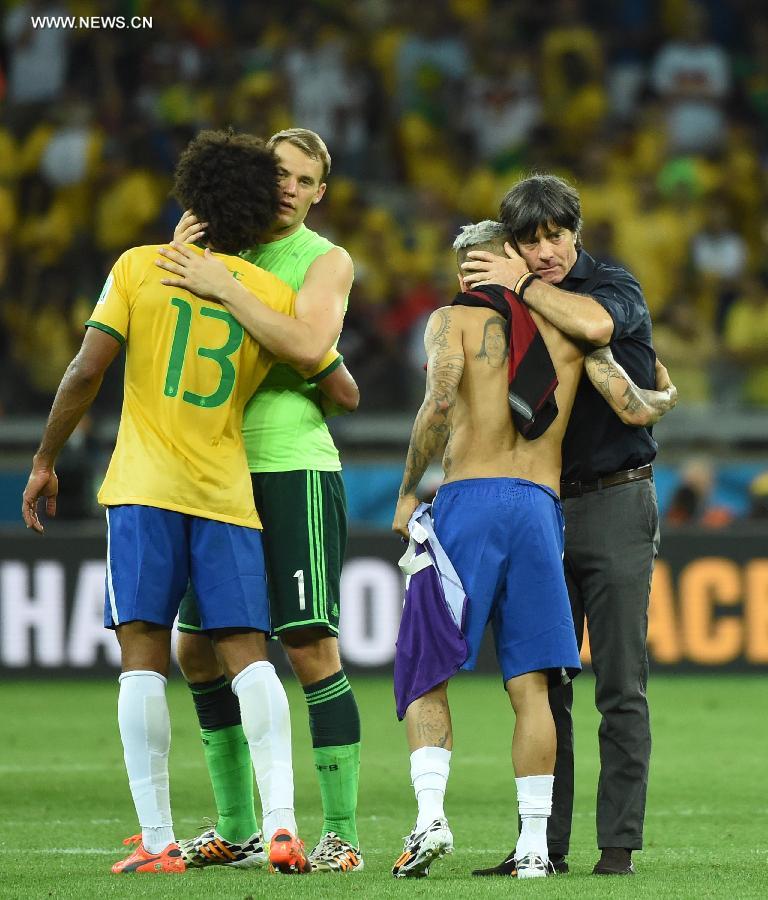 Germany's coach Joachim Loew (1st R) and goalkeeper Manuel Neuer (2nd L) greet Brazil's Dante (1st L) after a semifinal match between Brazil and Germany of 2014 FIFA World Cup at the Estadio Mineirao Stadium in Belo Horizonte, Brazil, on July 8, 2014. Germany won 7-1 over Brazil and qualified for the final on Tuesday. (Xinhua/Liu Dawei) |