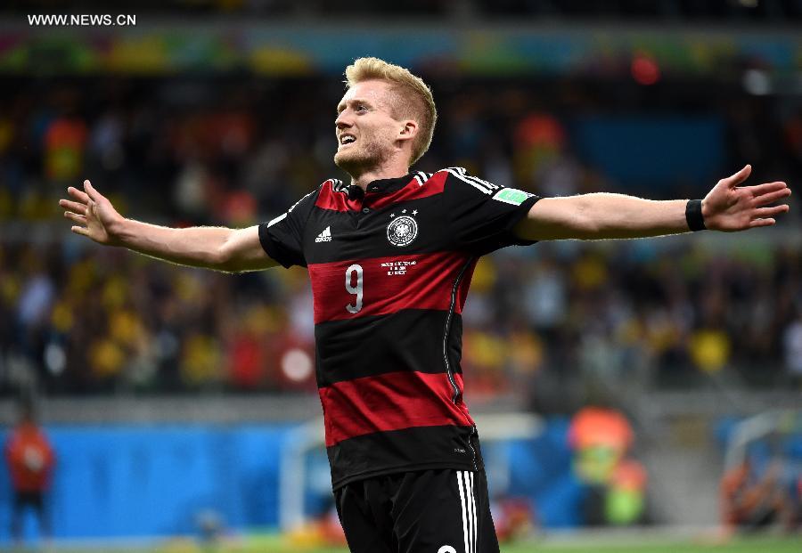 Germany's Andre Schuerrle celebrates a goal during a semifinal match between Brazil and Germany of 2014 FIFA World Cup at the Estadio Mineirao Stadium in Belo Horizonte, Brazil, on July 8, 2014. Germany won 7-1 over Brazil and qualified for the final on Tuesday.(Xinhua/Li Ga) |