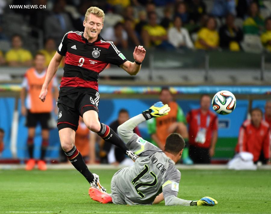 Brazil's goalkeeper Julio Cesar vies with Germany's Andre Schuerrle during a semifinal match between Brazil and Germany of 2014 FIFA World Cup at the Estadio Mineirao Stadium in Belo Horizonte, Brazil, on July 8, 2014. Germany won 7-1 over Brazil and qualified for the final on Tuesday.(Xinhua/Li Ga)