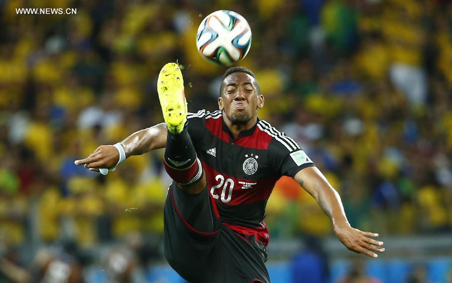 Germany's Jerome Boateng vies for the ball during a semifinal match between Brazil and Germany of 2014 FIFA World Cup at the Estadio Mineirao Stadium in Belo Horizonte, Brazil, on July 8, 2014. Germany won 7-1 over Brazil and qualified for the final on Tuesday.(Xinhua/Chen Jianli) |