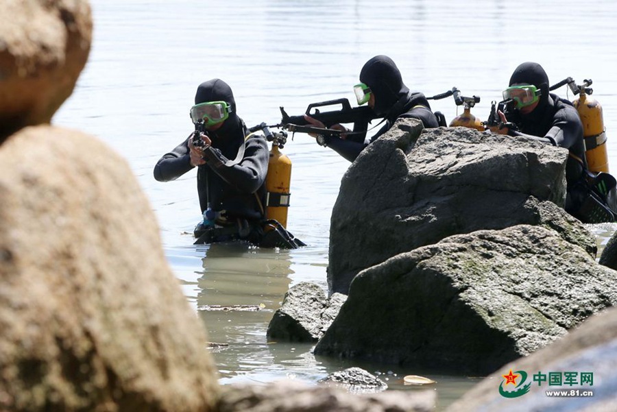 Frogman team in PLA's Guangzhou MAC carries out a combat training underwater in unknown sea on July 4, 2014. (Photo/Yu Chen)