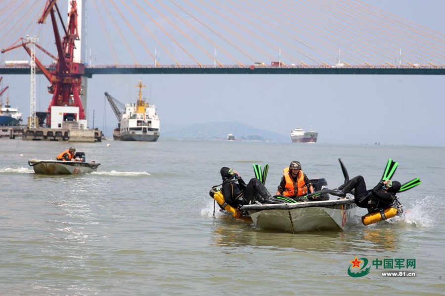 Frogman team in PLA's Guangzhou MAC carries out a combat training underwater in unknown sea on July 4, 2014. (Photo/Yu Chen)