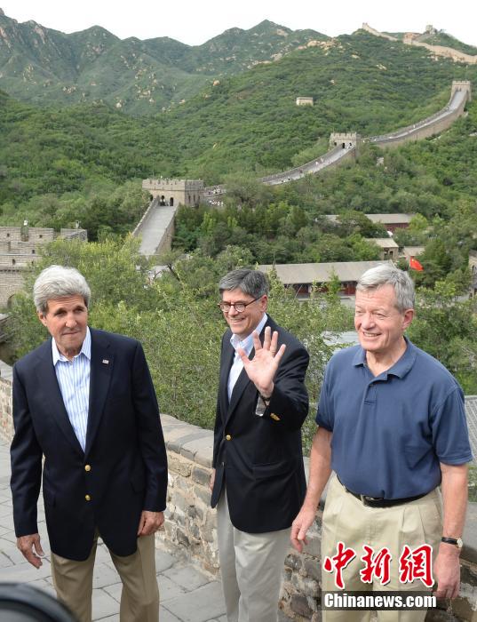 U.S. Secretary of State John Kerry (L) and U.S. Treasury Secretary Jacob Lew (M) visit Badaling Great Wall in Beijing, July 8. They are accompanied by U.S. ambassador to China Max Baucus (R). (CNS/Hou Yu)