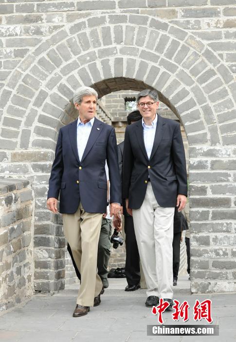U.S. Secretary of State John Kerry (L) and U.S. Treasury Secretary Jacob Lew (R) visit Badaling Great Wall in Beijing, July 8. (CNS/Hou Yu)