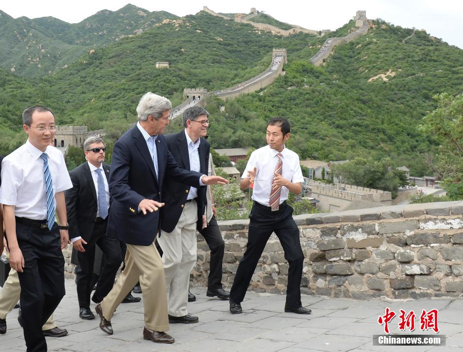 U.S. Secretary of State John Kerry (L2) and U.S. Treasury Secretary Jacob Lew (R2) visit Badaling Great Wall in Beijing, July 8. (CNS/Hou Yu)