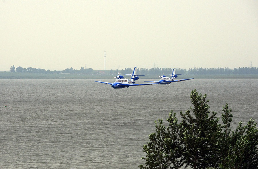 Two BE-103 amphibious air-craft, imported from Russia, make test flight at Faku Caihu airport on July 8, 2014. The aircraft can operate on paved and unpaved runways as well as from inland water reservoirs and offshore waters. (Photo/ Yang Qing)