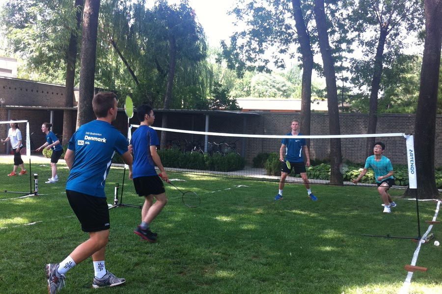 The Danish Badminton Inspiration Team plays a friendly match with Chinese social media users on the outdoor badminton courts at the Danish Embassy in Beijing July 8, 2014. (Photo/People’s Daily Online)