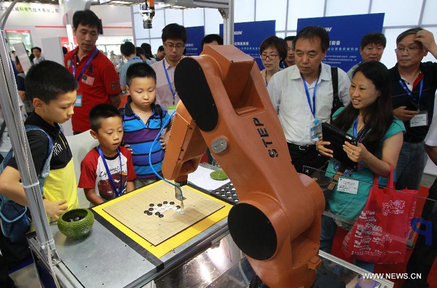 A boy plays gobang against a robot during the China International Robot Show in east China's Shanghai, July 9, 2014. The three-day show kicked off on Wednesday, demonstrating latest achievements in the robot industry. (Xinhua/Pei Xin)