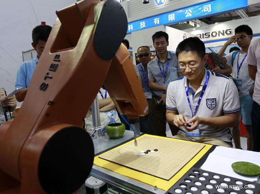 A man plays gobang against a robot during the China International Robot Show in east China's Shanghai, July 9, 2014. The three-day show kicked off on Wednesday, demonstrating latest achievements in the robot industry. (Xinhua/Ding Ting)