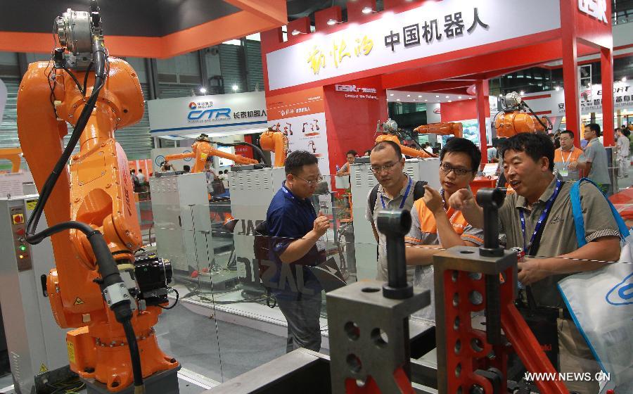 Visitors look at a robot during the China International Robot Show in east China's Shanghai, July 9, 2014. The three-day show kicked off on Wednesday, demonstrating latest achievements in the robot industry. (Xinhua/Pei Xin)