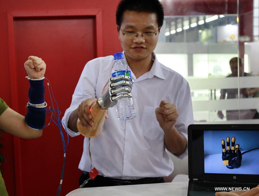 An exhibitor demonstrates how to use a robot hand to catch things during the China International Robot Show in east China's Shanghai, July 9, 2014. The three-day show kicked off on Wednesday, demonstrating latest achievements in the robot industry. (Xinhua/Ding Ting) |