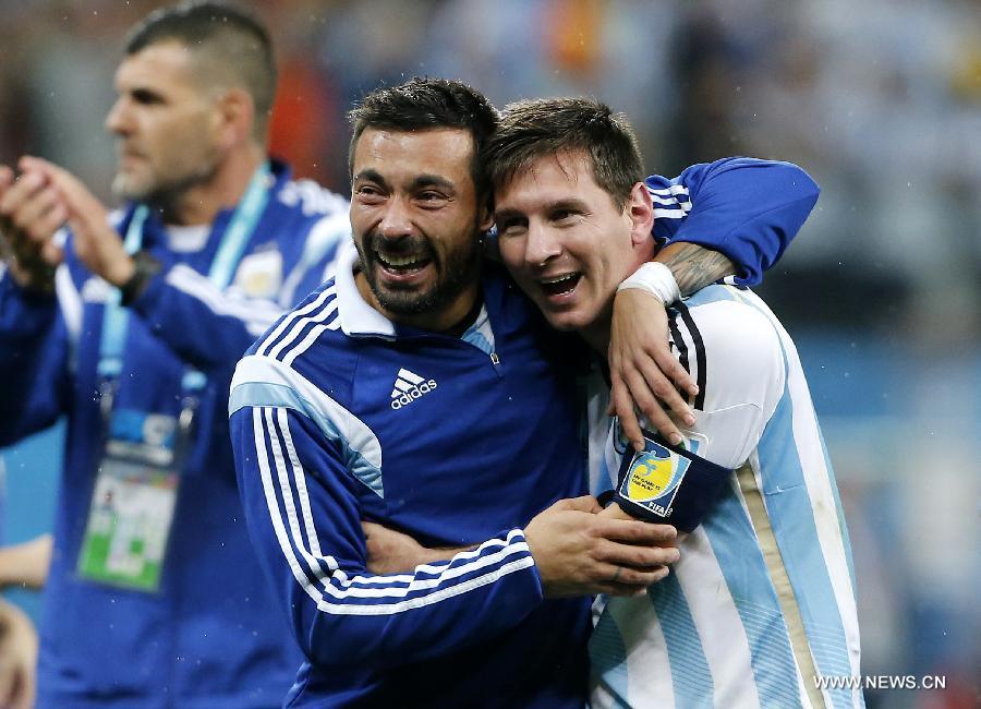 Argentina's Lionel Messi (R) and Ezequiel Lavezzi (C) celebrate their victory after a semifinal match between Netherlands and Argentina of 2014 FIFA World Cup at the Arena de Sao Paulo Stadium in Sao Paulo, Brazil, on July 9, 2014. Argentina won 4-2 on penalties over Netherlands after a 0-0 tie and qualified for the final on Wednesday. (Xinhua/Zhou Lei) |