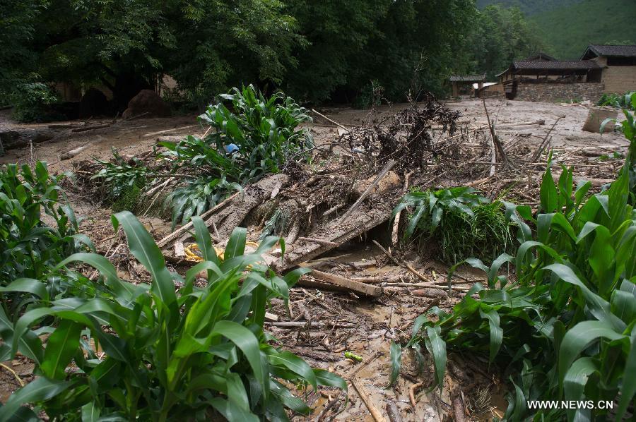 Photo taken on July 10, 2014 shows the site after a rain-triggered landslide hit Gelan Village of Shangri-La County in Diqing Prefecture, southwest China's Yunnan Province. Two people went missing and three others injured in the landslide which occurred on early Thursday morning. (Xinhua/Luo Xiaoguang)
