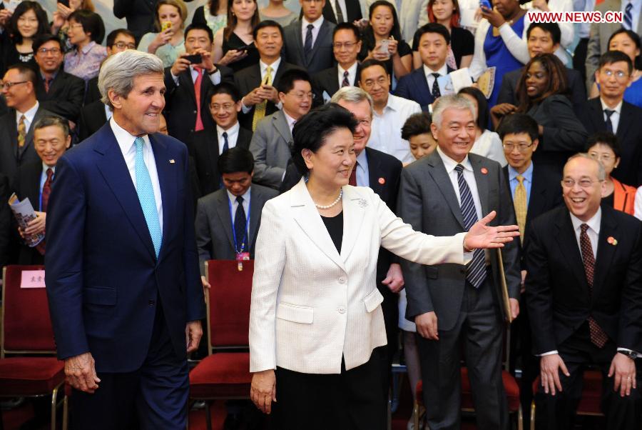 Chinese Vice Premier Liu Yandong (2nd L, front) and U.S. Secretary of State John Kerry (1st L, front) attend the Fifth Round of China-U.S. High-Level Consultation on People-to-People Exchange (CPE) in Beijing, capital of China, July 10, 2014. The CPE was hosted by Liu and Kerry. (Xinhua/Zhang Duo) |