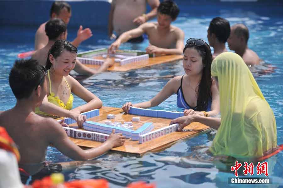 Citizens were spending hot days in water playing majhong in southwest China's Chongqing municipality. (China News Service/Chen Chao)