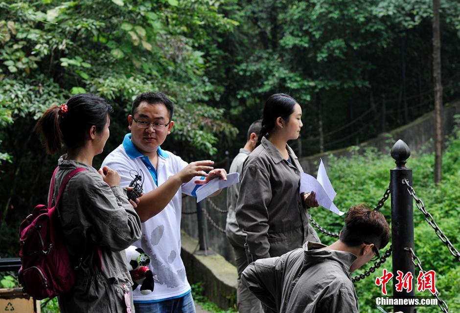 Twelve university students from Taiwan and Sichuan provinces arrive at Ya'an Bifengxia Breeding Base of the China Giant Panda Protection and Research Center, home town of the first Taiwan-born panda Yuan Zai on July 7, 2014. They cleaned the pandas' house, prepared milk and fed the giant pandas and recorded the rhythm of pandas' body movements. ( Chinanews.com/ Li Huajun) |