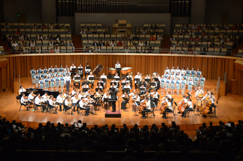 The Shabanzhuang Primary School choir from Beijing's Chaoyang District participates in the grand finale Xin Jin Shan Symphonic Poem at the National Grand Theatre in Beijing, July 8, 2014. (People's Daily Online/Du Mingming)