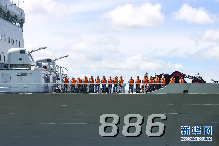Photo taken on July 9, 2014 shows Chinese navy's destroyer Haikou leaving Pearl Harbor in Hawaii, the United States. The Chinese fleet participating in the Rim of the Pacific (RIMPAC) multinational naval exercises left Pearl Harbor for the exercise area on Wednesday. (Xinhua/Qin Haishi) |