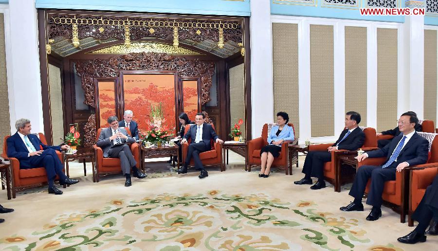 Chinese Premier Li Keqiang (3rd L, front) meets with U.S. Secretary of State John Kerry (1st L) and Treasury Secretary Jacob Lew (2nd L, front) in Beijing, capital of China, July 10, 2014. John Kerry and Jacob Lew came here to attend the Sixth Round of China-U.S. Strategic and Economic Dialogue and the Fifth Round of China-U.S. High-Level Consultation on People-to-People Exchange. (Xinhua/Li Tao) |
