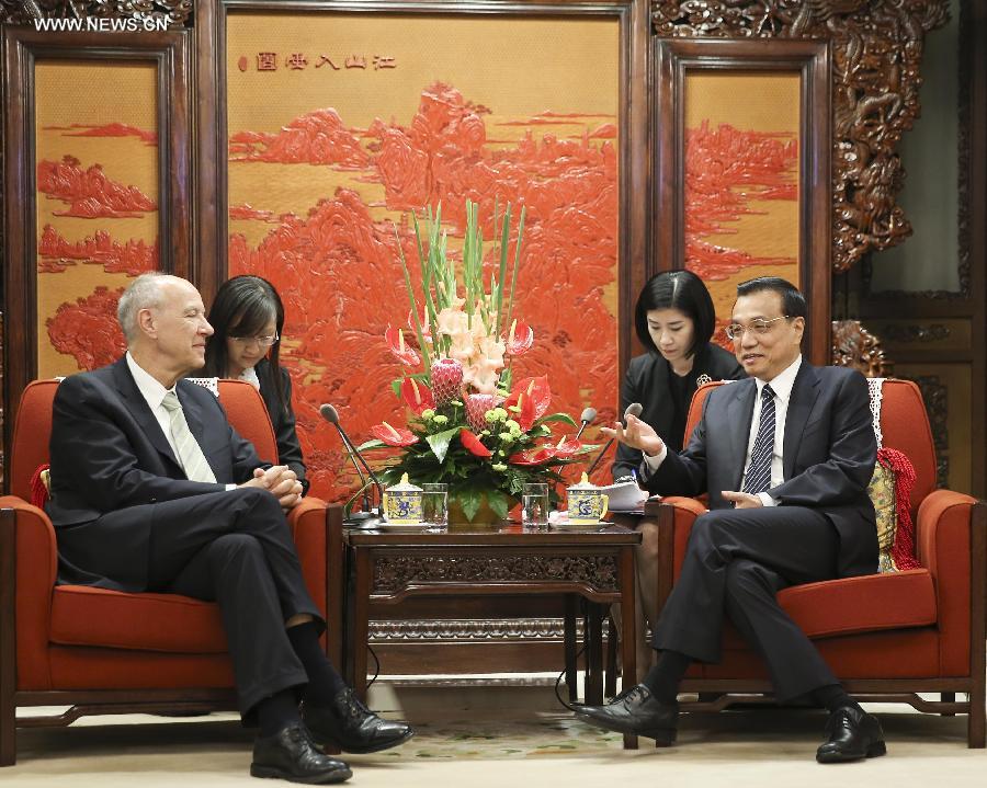 Chinese Premier Li Keqiang (R) meets with Francis Gurry, Director General of the World Intellectual Property Organization (WIPO), in Beijing, capital of China, July 11, 2014. (Xinhua/Ding Lin)