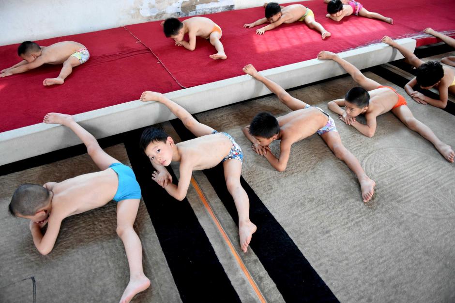 Children receive training under the guidance of the coach during the summer vacation in Bozhou City, east China's Anhui Province, July 9, 2013. Some parents sent their children to receive gymnastics training in summer, hoping that the children will have a better physical condition and a rich vacation life. (Photo/CNS)