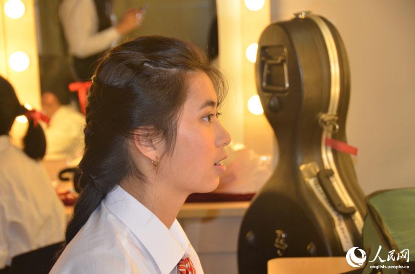 A member of the Australian New Goldberg Orchestra puts on makeup in the dressing room of the National Grand Theatre in Beijing, July 8, 2014. (People's Daily Online/Du Mingming)
