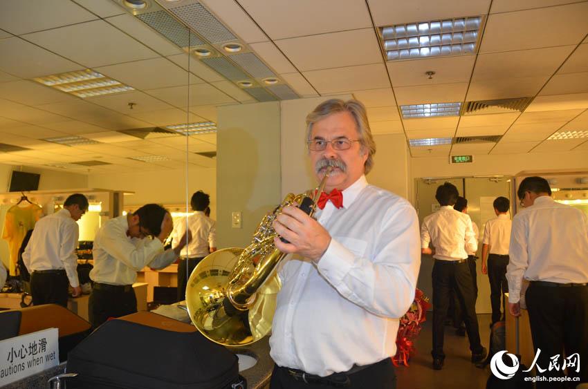 A member of the Australian New Goldberg Orchestra practices in the dressing room of the National Grand Theatre in Beijing, July 8, 2014. (People's Daily Online/Du Mingming)