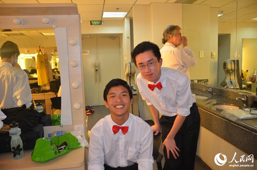 Members of the Australian New Goldberg Orchestra pose for photo in the dressing room of the National Grand Theatre in Beijing, July 8, 2014. (People's Daily Online/Du Mingming)