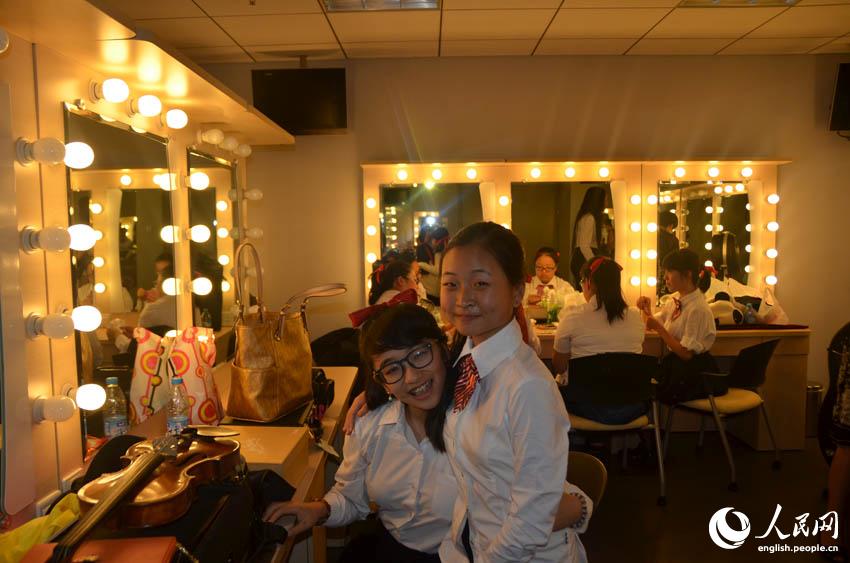 Members of the Australian New Goldberg Orchestra pose for photo in the dressing room of the National Grand Theatre in Beijing, July 8, 2014. (People's Daily Online/Du Mingming)