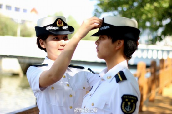 The first three female Uyghur students from Xinjiang Uyghur Autonomous Region have been studying at PLA Dalian Naval Academy for a year until this July. (Photo/Chinamil.com.cn)
