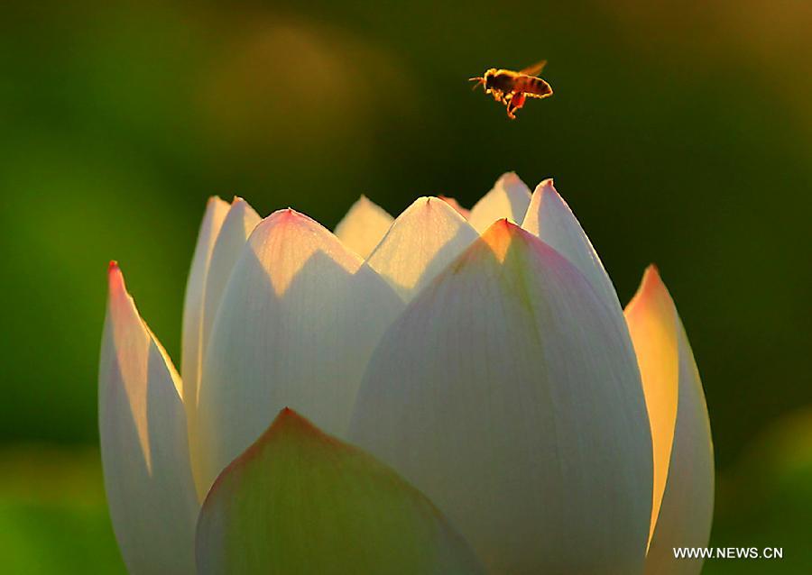 A bee collects honey on a lotus flower at the Lotus Park in Luoyang, central China's Henan Province, July 13, 2014. (Xinhua/Wang Song)