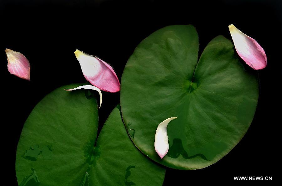 Lotus petals float on water at the Lotus Park in Luoyang, central China's Henan Province, July 13, 2014. (Xinhua/Wang Song)